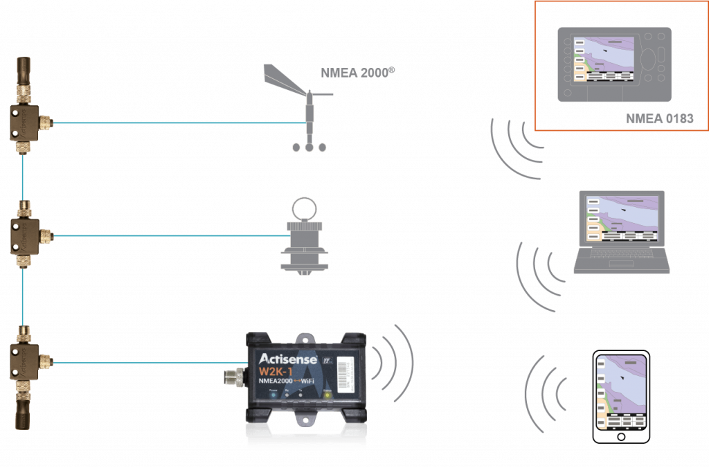 Der W2K-2 verfügt über eine integrierte Konvertierung von NMEA 2000-Nachrichten in NMEA 0183-Sätze, sodass eine Vielzahl von Schiffsdaten (z. B. Position, Geschwindigkeit, Kurs, Windgeschwindigkeit, Tiefe, Motordaten, AIS-Nachrichten usw.) mit NMEA 0183-kompatiblen Softwareanwendungen geteilt werden können, die auf angeschlossenen Geräten ausgeführt werden.
