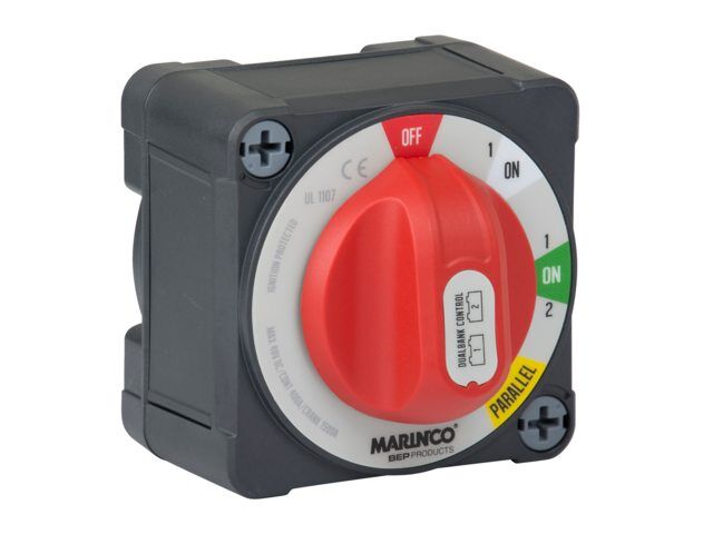 Dieser innovative Pro-Installer-Batterieschalter für zwei Batterien oder zwei Batteriebänke ist wie drei Schalter in einem für ein sehr intuitives Umschalten zwischen zwei Batteriebänken. Dieser Schalter ermöglicht das Einschalten einer Starterbatterie und einer Servicebatterie, wobei beide Stromkreise isoliert sind. Bei der Parallelstellung schaltet der Batterieschalter die Batterien parallel, um beispielsweise den Motor im Notfall zu starten.