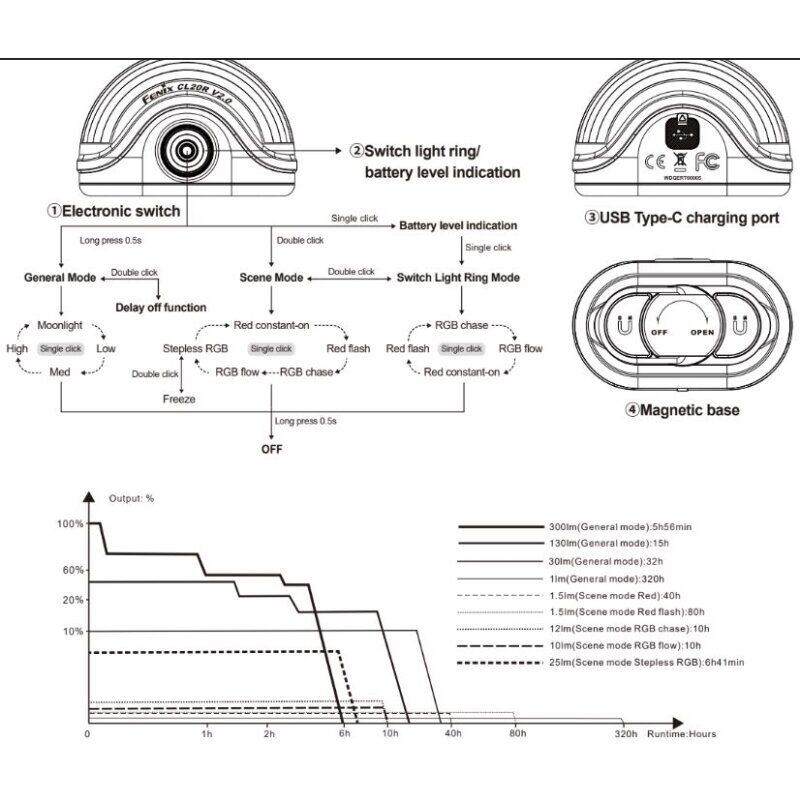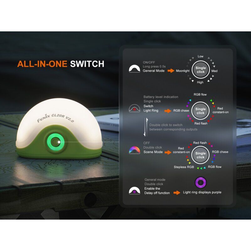 Verschönern Sie Ihren Raum mit bezaubernden RGB-Lichteffekten wie RGB-Chase, RGB-Flow und Stepless RGB, die alle für eine gemütliche und romantische Stimmung sorgen. Die Verzögerungsfunktion ist in den allgemeinen Modus integriert, wodurch sich die CL20R V2.0 ideal als Nachtlicht eignet. Betrieben wird die Fenix CL20R V2.0 mit dem mitgelieferten Fenix ARB-LP1900-Akku oder verwenden Sie einfach drei AAA-Batterien als praktische Alternative.