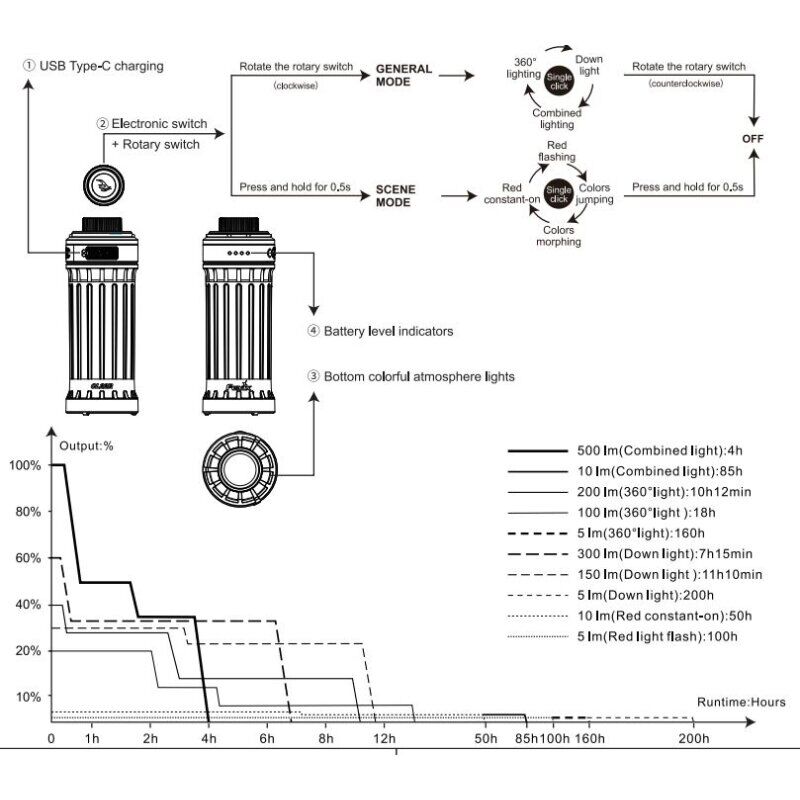 360°-Beleuchtungsmodus mit einem maximalen Strahldurchmesser von 20 Metern, während der Abwärtslichtmodus eine maximale Leuchtweite von 80 Metern. Beide Modi können zusammen verwendet werden.