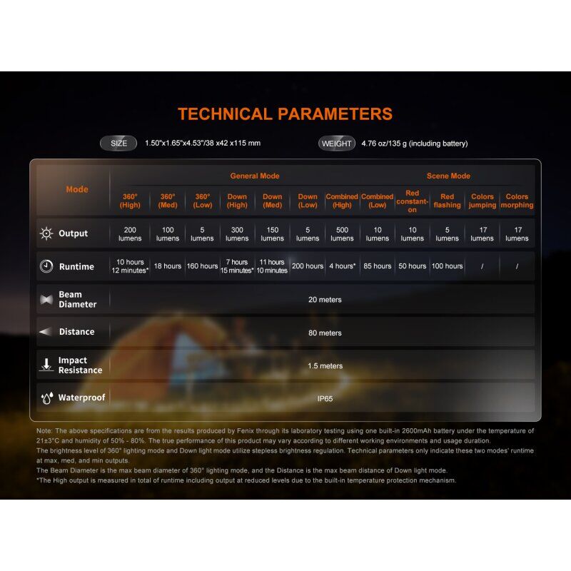 *Hinweis: Die oben genannten Spezifikationen stammen von den Ergebnissen, die Fenix in seinen Labortests mit einem eingebauten 2600mAh-Akku bei einer Temperatur von 21±3°C und einer Luftfeuchtigkeit von 50% - 80% ermittelt hat. Die tatsächliche Leistung dieses Produkts kann je nach Arbeitsumgebung und Nutzungsdauer variieren.