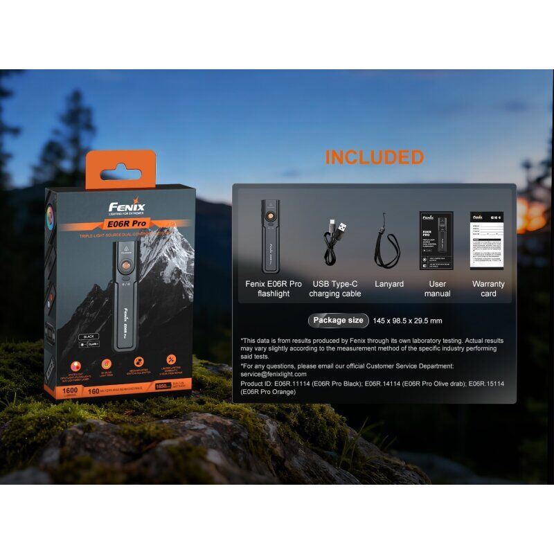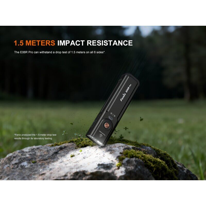Die Fenix E06R Pro ist das Flaggschiff der EDC-Taschenlampen. Über ihre 4-fachen Lichtquellen mit 1.600 Lumen Spotlicht, Flutlicht, Rotlicht und einem ebenso roten Laser ist die E06R Pro jeder Alltagssituation gewachsen. Dabei ist sie trotz des leistungsstarken 1.650mAh Akku nur 12,3 x 3,1 x 1,9 cm groß. Ihr rechteckiges Format lässt sich problemlos und elegant im Alltag tragen. Dabei ist durch den starken Gürtelclip eine Vielzahl von Trageweisen möglich. Aufgeladen wir die E06R Pro selbstverständlich über einen gekapselten USB-C Anschluss.