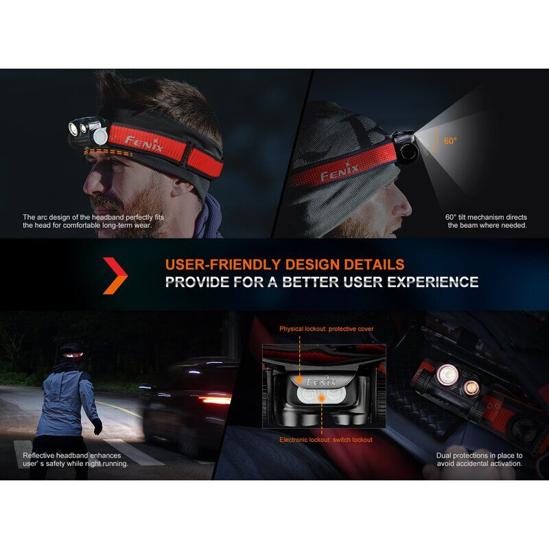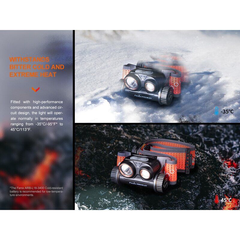 Die Fenix HM65R-DT ist eine wiederaufladbare Stirnlampe. Die Dual-Spotlights kombinieren weißes und warmes Licht. Diese werden durch zwei separate Schalter gesteuert.