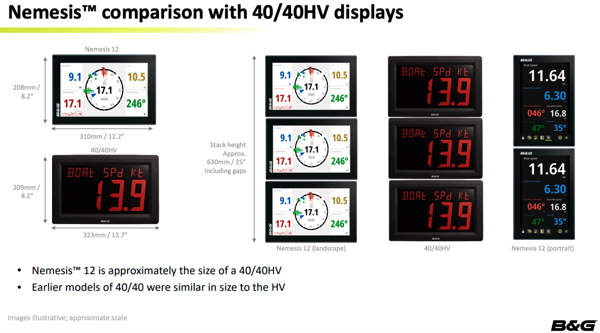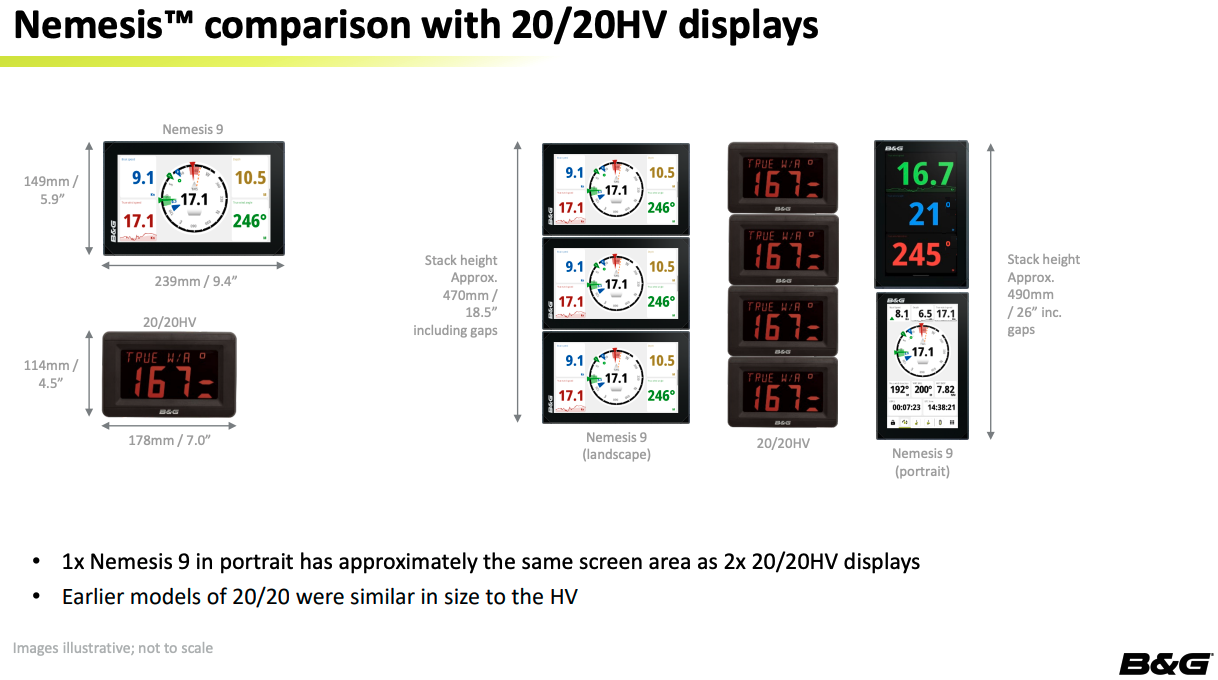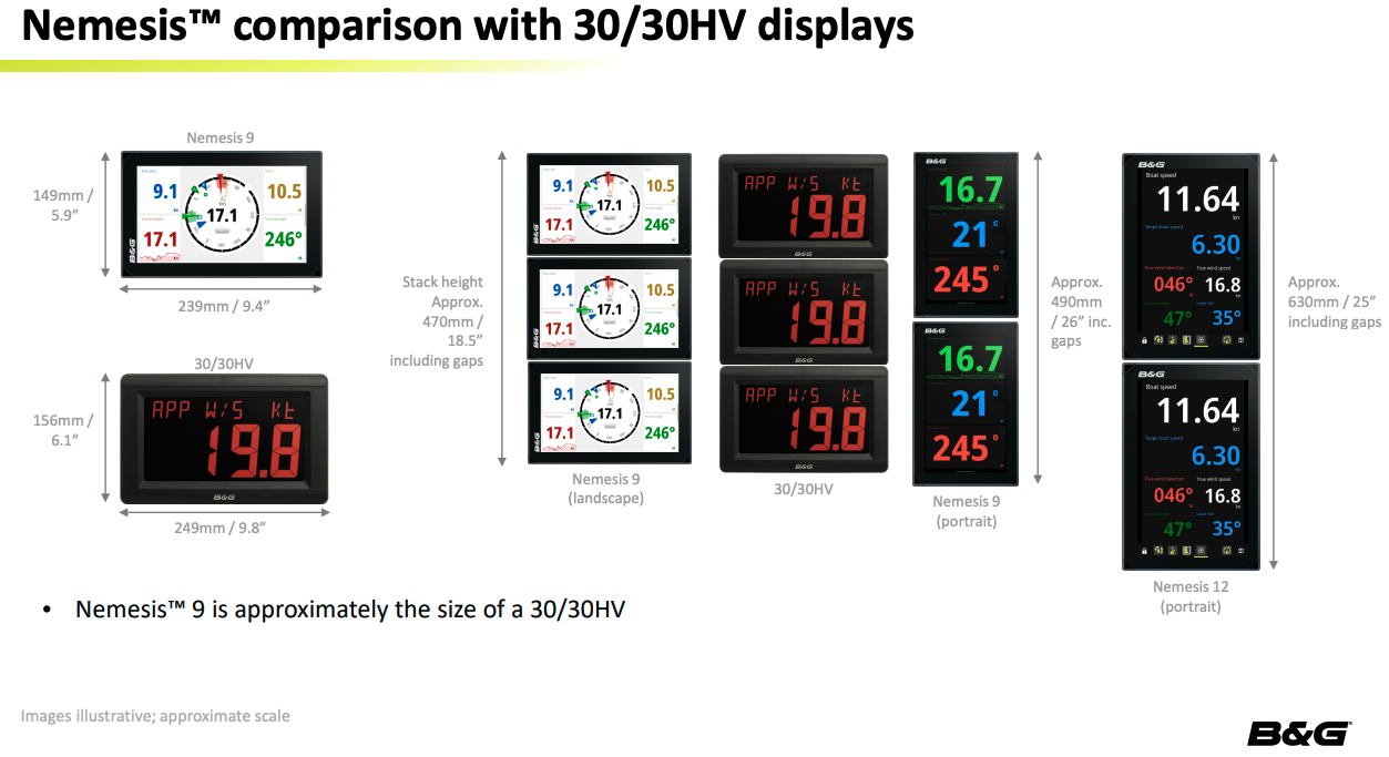 Falls Sie in Ihrer Triton2 oder H5000 Systemlandschaft planen die älteren B&G 20/20HV Displays oder die B&G 30/30HV oder B&G 40/40HV gegen die kristallklaren B&G Nemesis zu tauschen, hier ein paar Infos zum Größenvergleich.