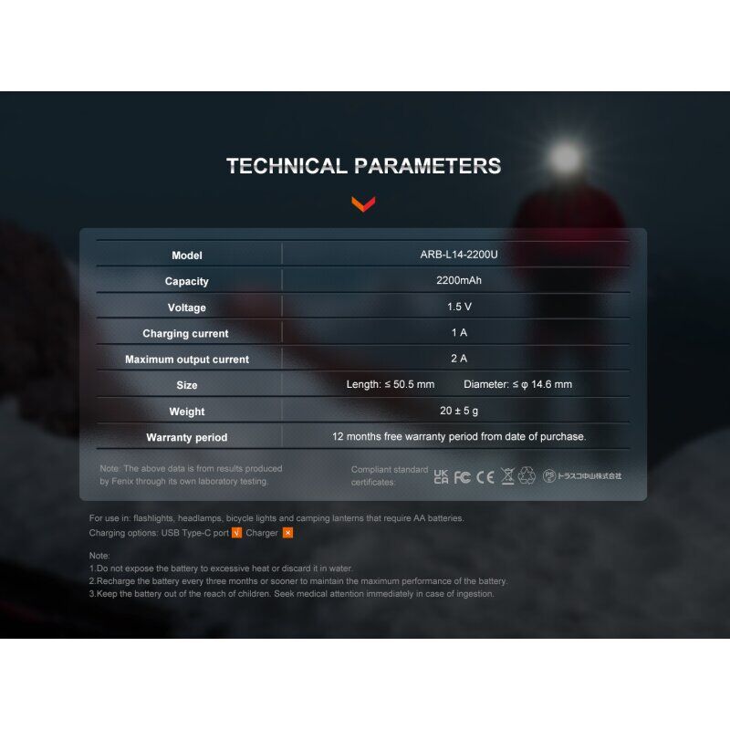 Fenix ARB-L14-2200U Typ-C wiederaufladbare 14500 Li-Ion Akku mit 1,5 Volt