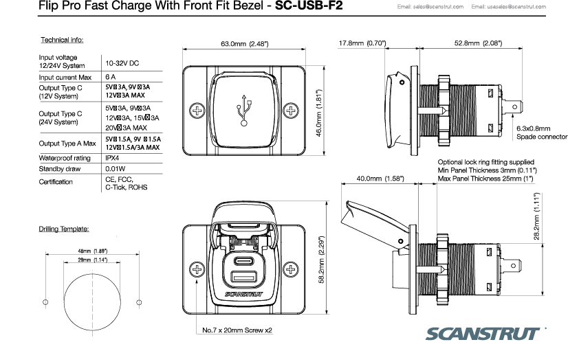 Flip Pro ist für die Verwendung mit einem 12-V- oder 24-V-Eingang ausgelegt und verfügt über 1x USB-A- und 1x USB-C-Ladeanschluss. Dies bietet die optimale Wahl der Verbindung und das schnellste Aufladen für Ihr Gerät an Bord.