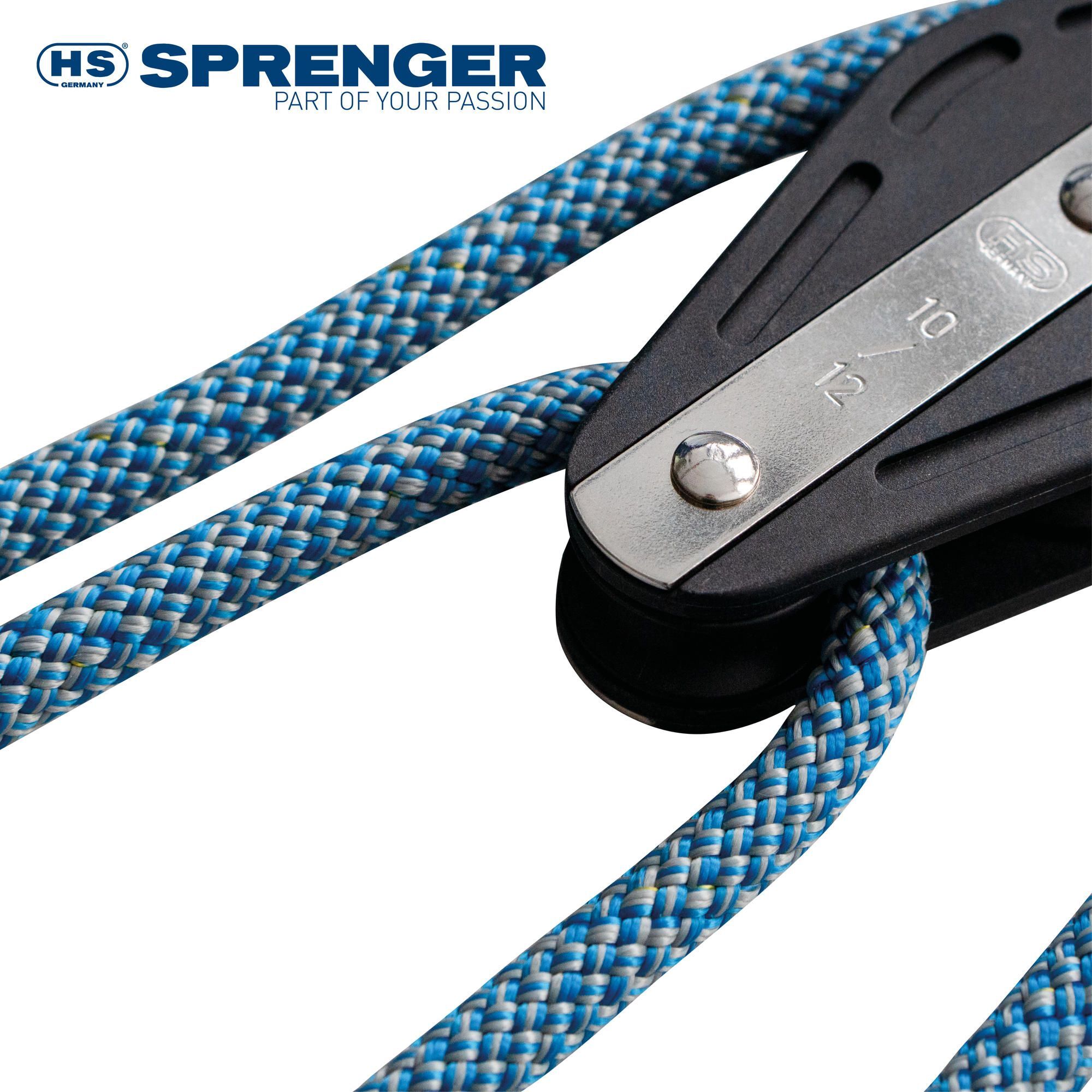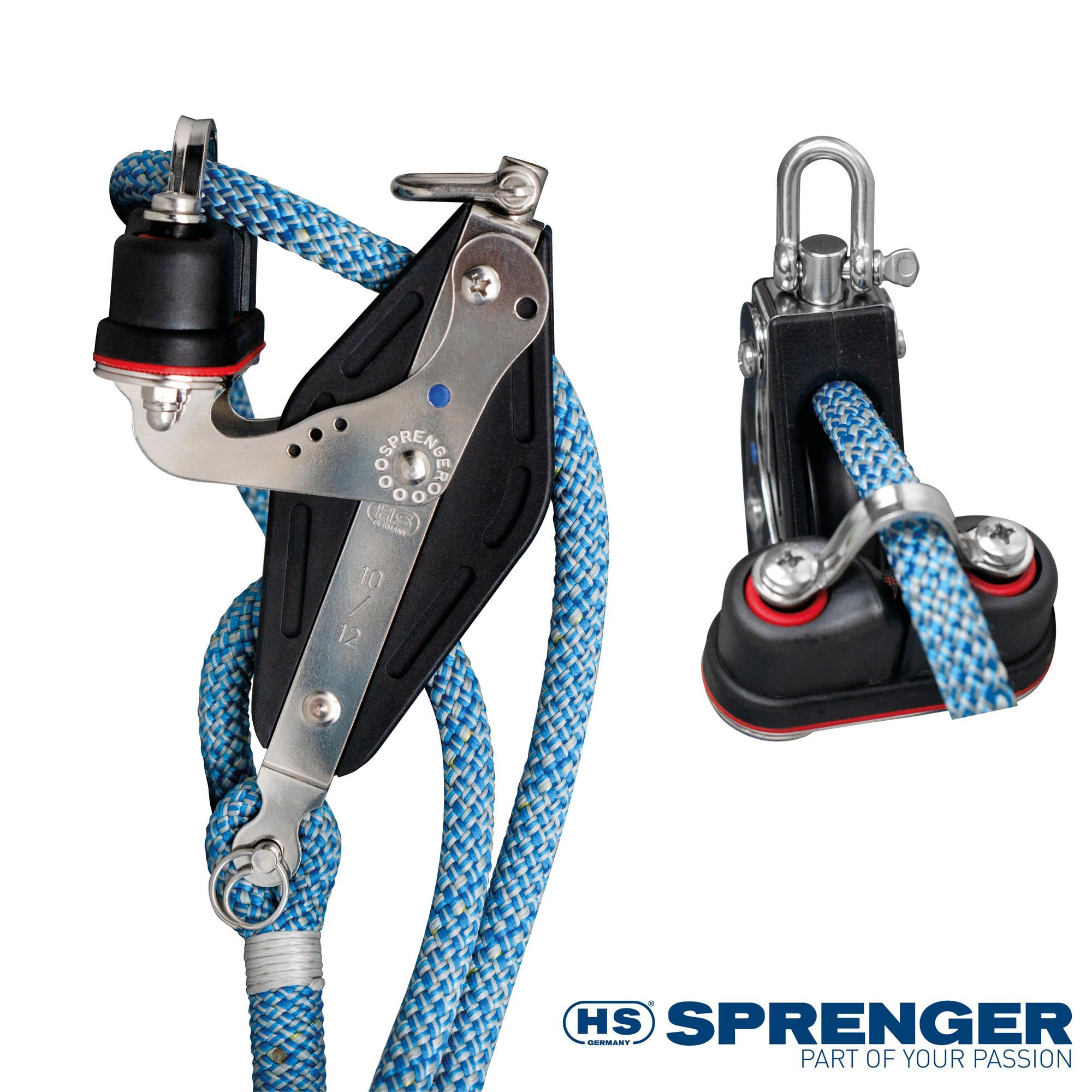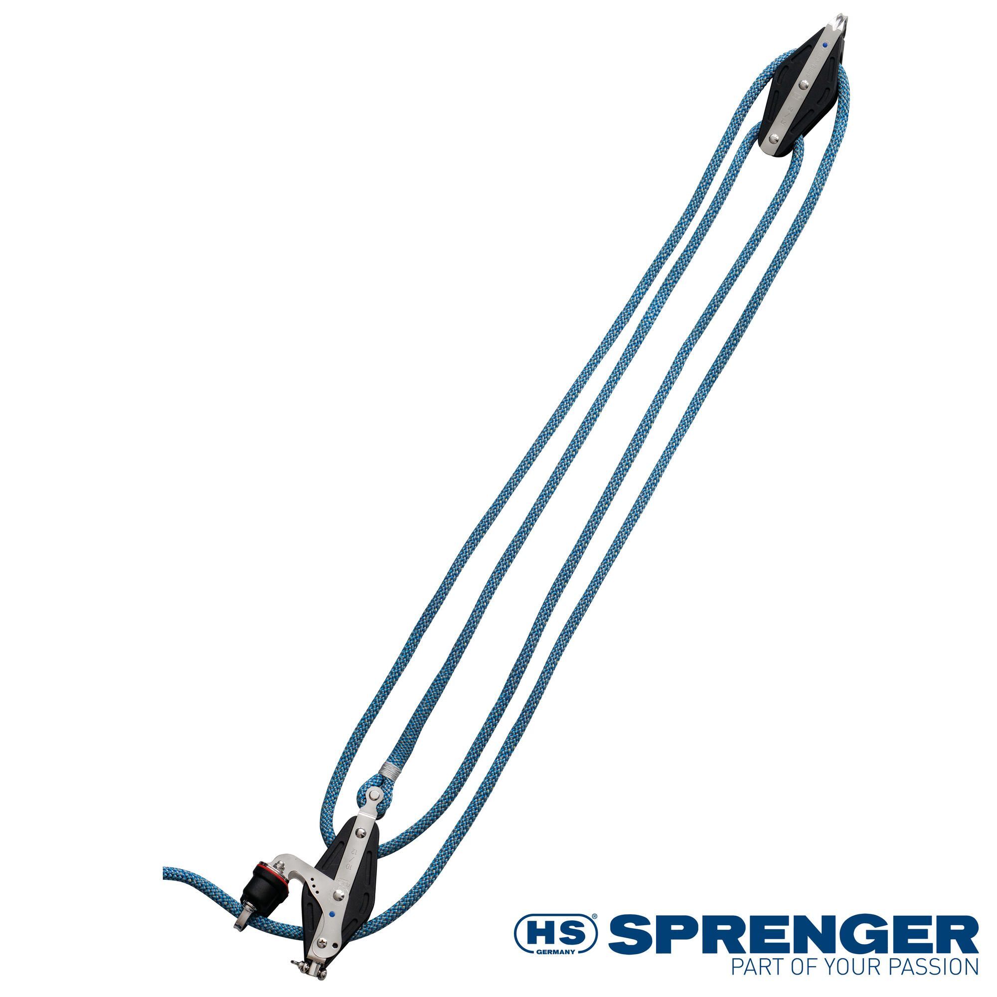 Die Talje wird mit deutschem Qualitäts-Tauwerk professionell gespleißt und in einer praktischen SPRENGER-Tasche (mit Reißverschluss) geliefert.