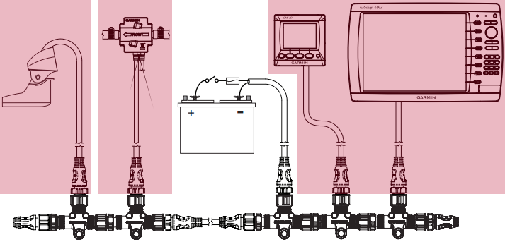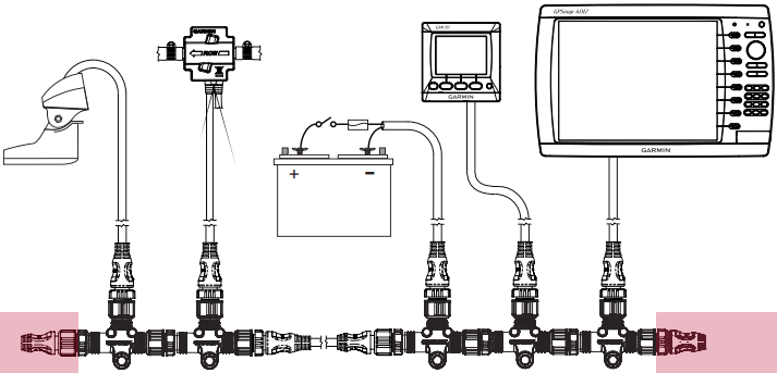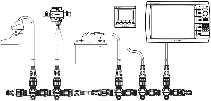 - Es dürfen höchstens 50 NMEA 2000-Geräte an das NMEA 2000-Netzwerk angeschlossen werden.