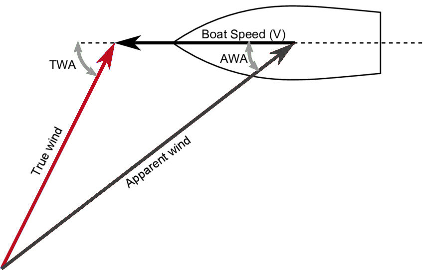 Der unmittelbare Wert des Windeinfallwinkels in Grad, den eine Windex, Windfahne oder ein Masttopgeber während der Fahrt anzeigt. Der AWA wird bei Fahrt durch den Fahrtwind beeinflusst und steht damit im Gegensatz zum TWA.