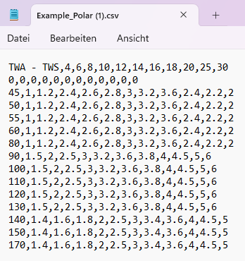 Polardaten bei Raymarine. Bei Raymarine entspricht die CSV Datei dem original Matrix Schema, wie weiter oben beschrieben. Eingeleitet in der ersten Zeile mit "TWA - TWS" danach in der ersten Zeile die Windgeschwindigkeit (TWS) und in der ersten Spalte die Winkel zum Wind (TWA). Dezimaltrenner auch hier der Punkt, als Feldtrenner verwendet Raymarine das Kommata.