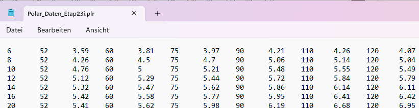 Die Tabelle kann man sich relativ schnell in Excel selber anlegen und dann als CSV Datei abspeichern. Ich habe diese CSV Datei anschließend mit dem Editor geöffnet und die Dezimaltrenner der Geschwindigkeiten von Komma in Punkt sowie die Feldtrenner von Semikolon in Tab geändert. Einfach zweimal den „Ersetzen“ Befehl benutzen. Danach die Datei mit der Dateiendung *.plr auf die microSD Karte des Plotters im Verzeichnis /Garmin/polars/… abspeichern.
